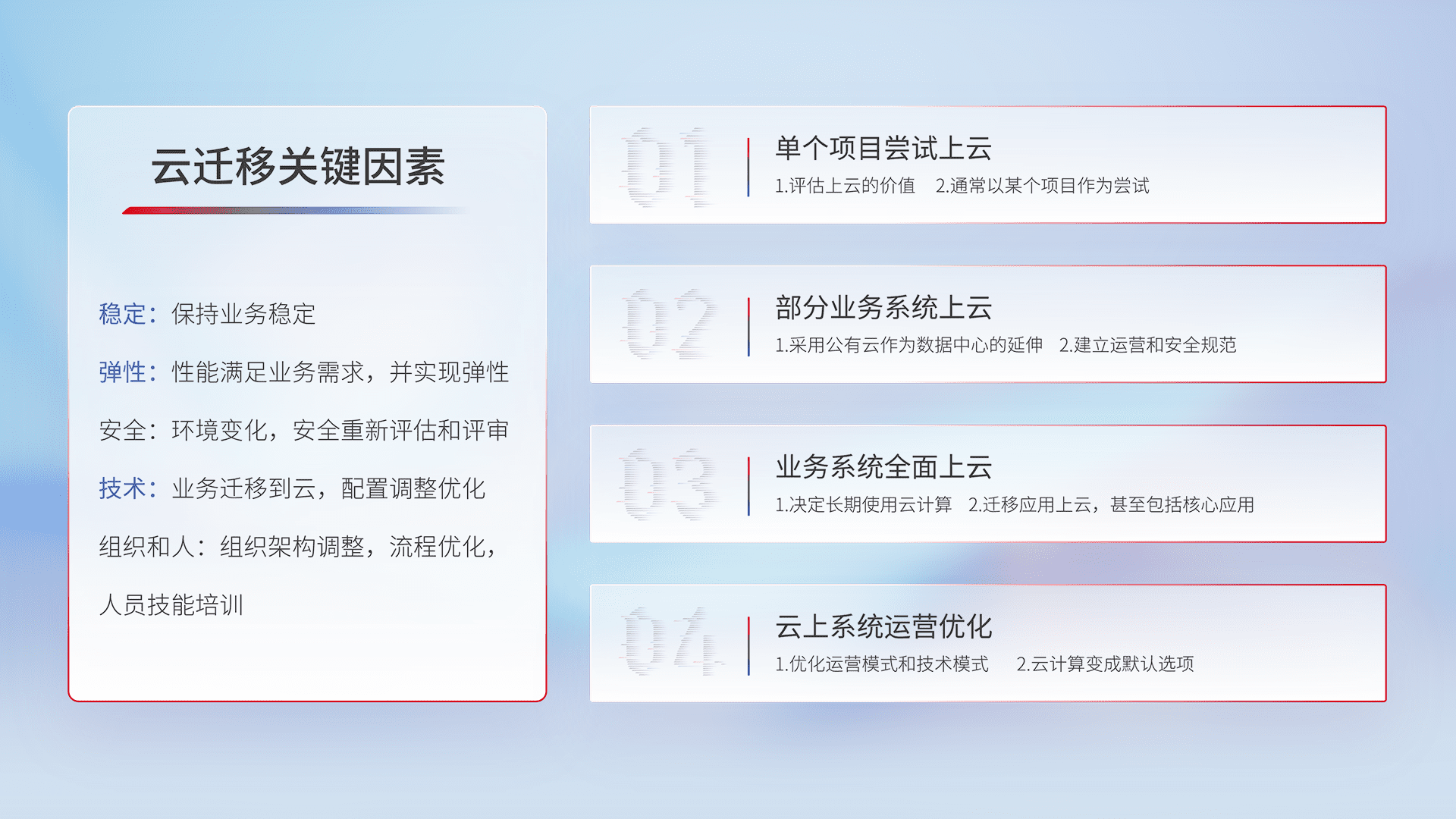 结合实际业务,,从规划设计、、、、云平台选型、、云原生改造、、、数据迁移、、、、集成交付,,迁移全过程为客户识别最佳上云路径,,做好风险识别管理,,,,设计网络架构、、、、身份权限、、安全审计合规、、操作审计、、、日志审计、、、监控告警策略、、、多站点容灾设计等,,对云上基础设施进行整体规划,,,,提升IT治理水平,,以满足弹性、、高可用、、、、高性能的需求。。