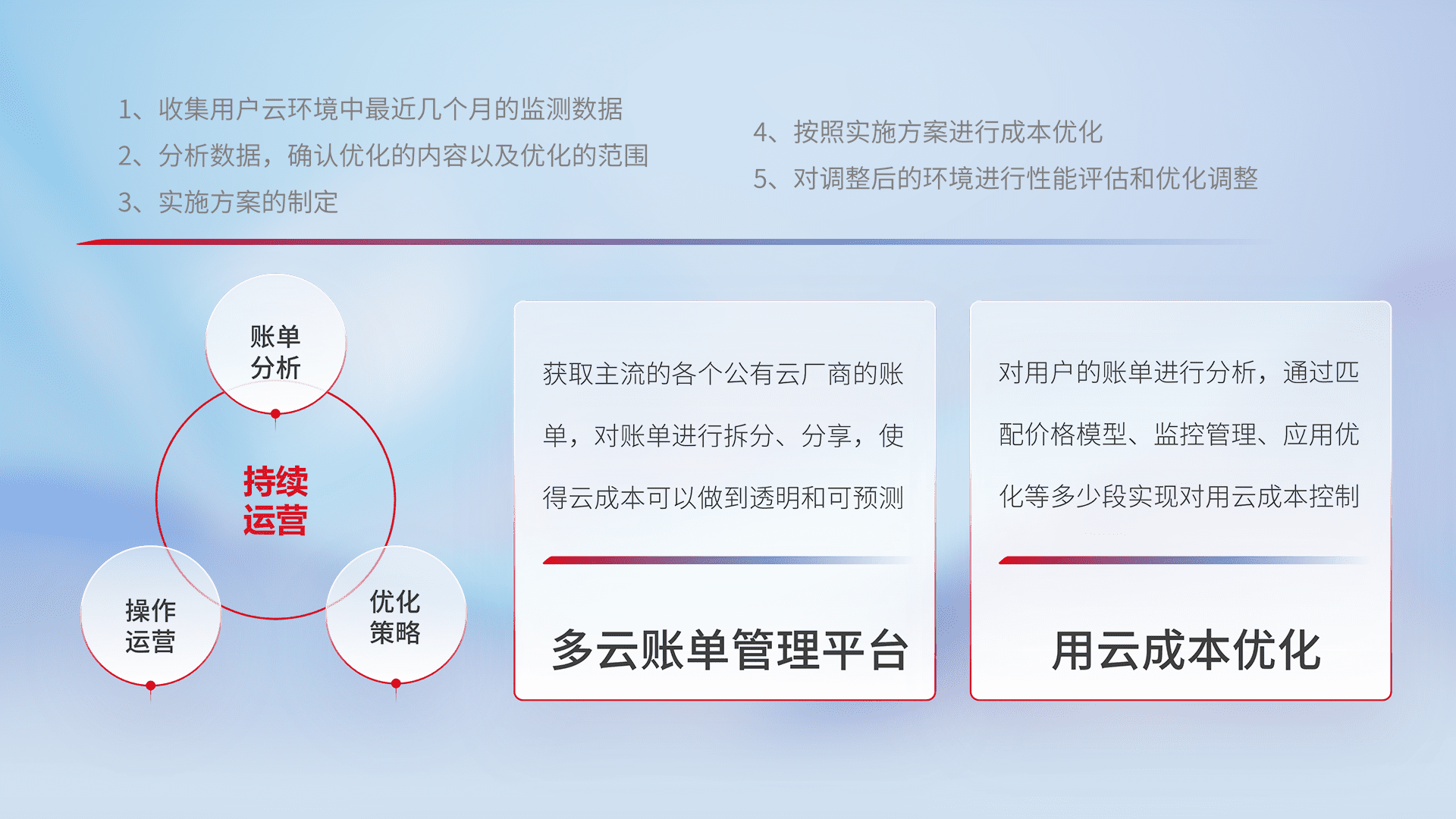 通过灵活运用多种自动化迁移工具,,,帮助企业用户实现业务和数据高效 、、、、稳定的上云迁移和云上迁移,,,采用自研多云纳管平台,,,以中立管理模式,,,,解决多组织、、、多云、、多运维厂商的复杂关系的管理,,,,保证多云平台资源配置的一致性,,,,实时掌控云资源运行数据,,运用智能化工具分析云资源多云平台的管理服务,,透明化管理成本支出,,用云成本可预测、、、、用云费用可优化、、、云资源配额有据可依。。