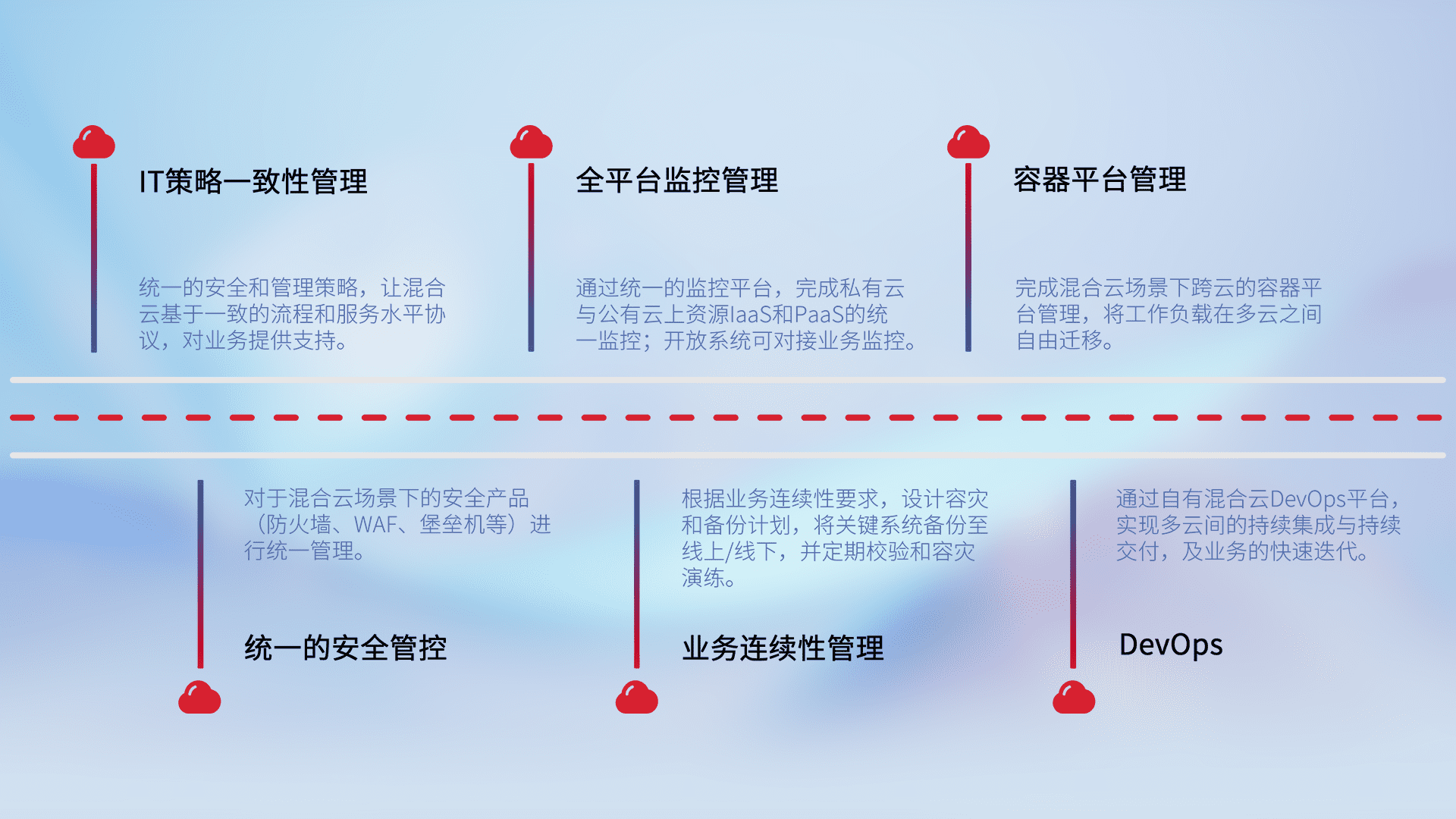 通过多云纳管,,,以统一的资源数据模型把客户的云资源进行抽象和封装,,进而实现对多云资源的统一操作,,保障云资源管理的可靠性、、、稳定性与可用性。。。。量身定制化运维内容,,配置、、、开发运维、、、补丁管理、、、、备份、、、、监控、、、认证和访问管理、、审计和日常巡检等,,保障在用云过程中的可靠度,,,稳定度以及高可用率。。