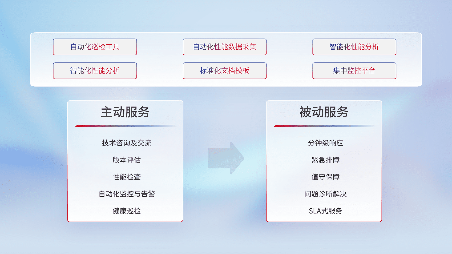 智能化工具和标准化文档,,,保障服务质量,,提供主动服务(包含技术咨询、、、、版本评估、、性能检查、、、自动化监控与告警、、健康巡检)和被动服务包含(分钟级响应、、、、紧急排障、、、、值守保障、、、、问题诊断解决、、、SLA服务)。。。