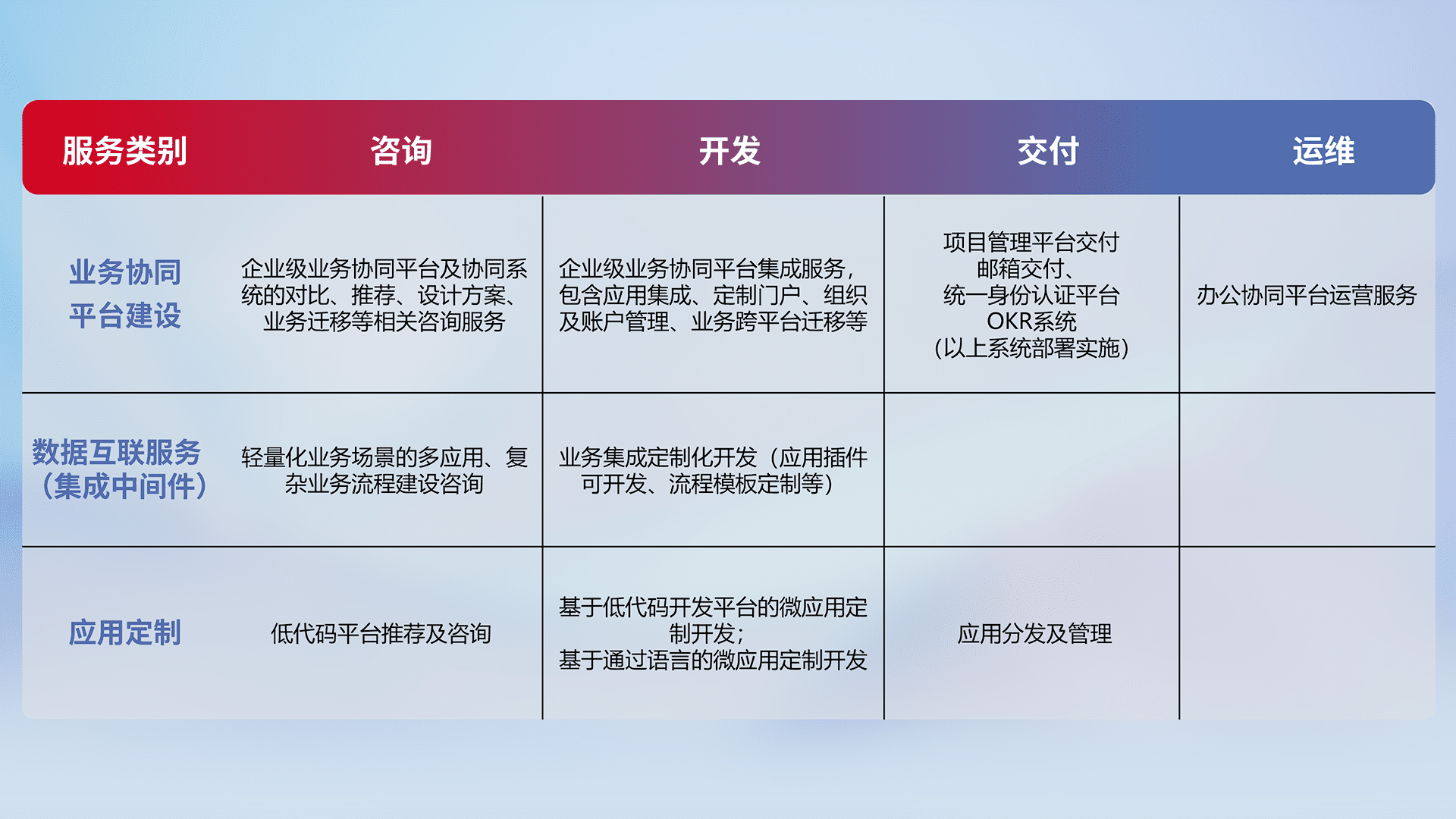 针对钉钉、、、、企微、、IDaas等平台级产品提供产品的规划、、、方案、、、交付、、、定制化开发等服务,,,实现如统一协同办公、、、、智能客户服务、、、混合会议管理、、、智能数据查询、、等业务场景,,,,实现数字化转型。。。。